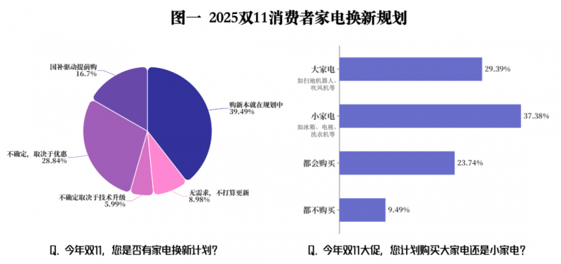 调研数据显示,尽管2023年以来“以旧换新”“国家补贴”政策已推动一轮家电换新,但市场消费需求未现明显降温。本次调研中,56.19%的受访者明确表示双11期间有家电购置计划,其中39.49%受访者称“购新本在计划内,双11国补+大促+以旧换新政策让购买更划算”,16.7%受访者则因“想抓住国补机遇”,将原本未规划的购新计划提前;另有28.84%受访者持观望态度,表示“是否购买取决于产品升级点能否真正打动自己”。