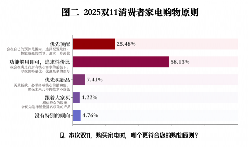 本次调研清晰显示,家电消费市场已形成“务实族”与“顶配族”两大核心群体,消费理念分化显著。其中,“务实族”占比58.13%,为市场主流,该群体坚持“功能够用即可”,在满足核心需求的前提下追求极致性价比,对国补、平台补贴、品牌优惠等多重让利敏感度极高;“顶配族”占比25.48%,他们认为家电属于长周期使用产品,倾向于在预算内选择“配置最好、性能最强”的型号,追求“一步到位”的使用体验。此外,7.41%受访者“优先买新品”,注重产品是否搭载核心前沿功能以避免技术落伍;4.22%受访者“跟着大家买”,优先选择销量排名领先的产品。