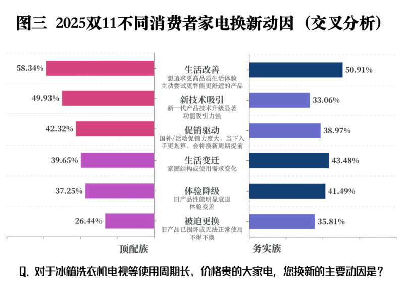 从换新动机看,两类群体差异明显。“顶配族”更倾向主动升级,49.93%因“新技术吸引”而换新,认为新一代产品功能吸引力强;58.34%为“追求更高品质生活体验”,愿意为AI识别、三筒洗等前沿功能投资。“务实族”则多受实际需求驱动,35.81%因“旧产品损坏被迫更换”,41.49%因“旧产品性能衰退”考虑换新,38.97%受“促销驱动”提前启动换新计划。