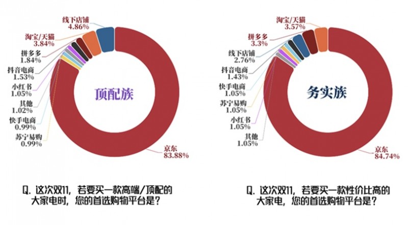 83.88%的“顶配族”首选京东,认可其“家电消费主场、新品大牌首发、品质信赖”的定位,相较线下渠道(4.86%)、淘宝/天猫(3.84%)的首选率优势较为明显。