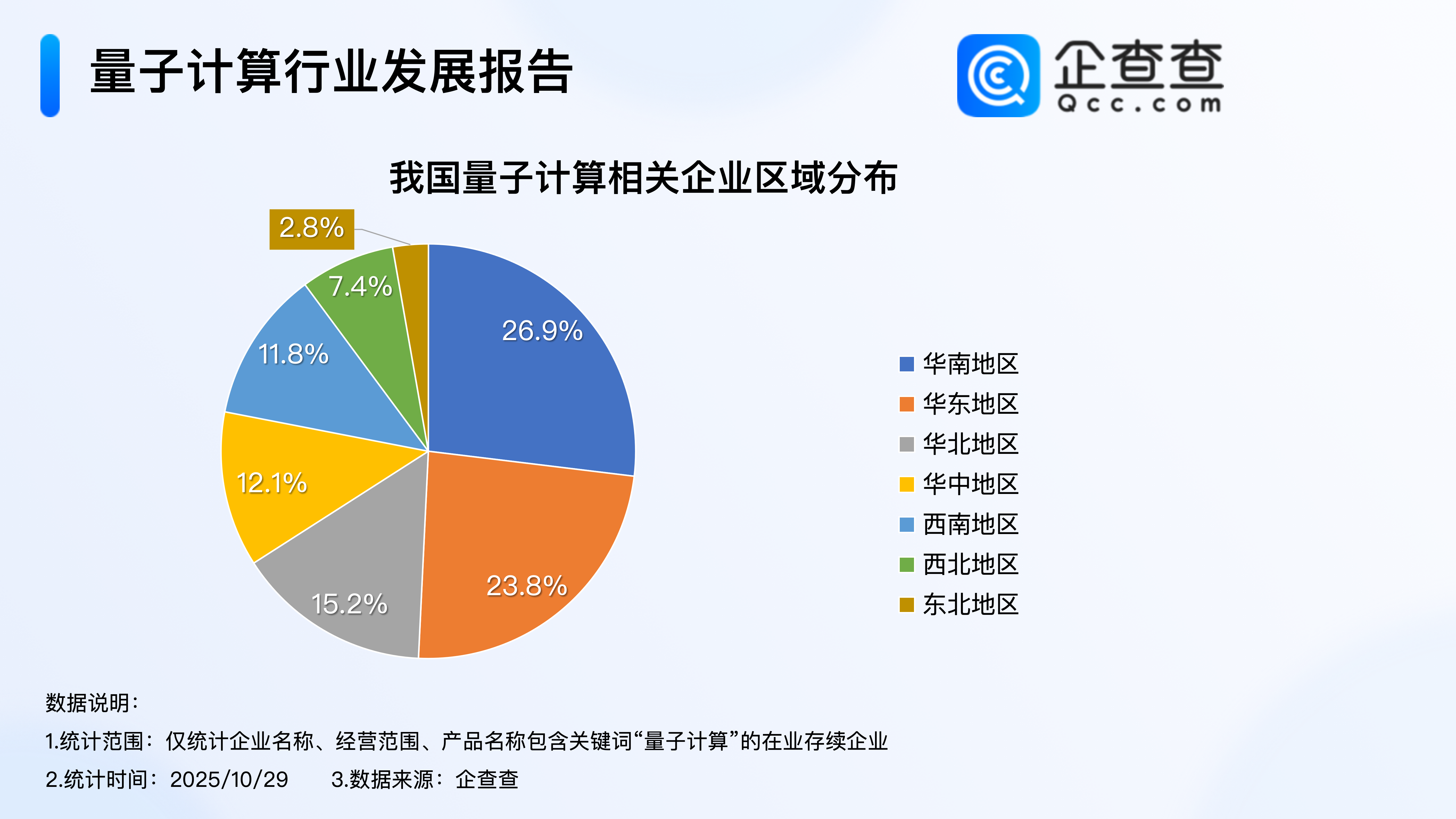 企查查数据显示,我国现存量子计算相关企业主要集中华南、华东地区,合计占比超五成,其中华南地区最多,占比26.9%;位于华北、华中地区的相关企业,分占15.2%、12.1%,东北地区量子计算相关企业存量相对较少,占比2.8%。