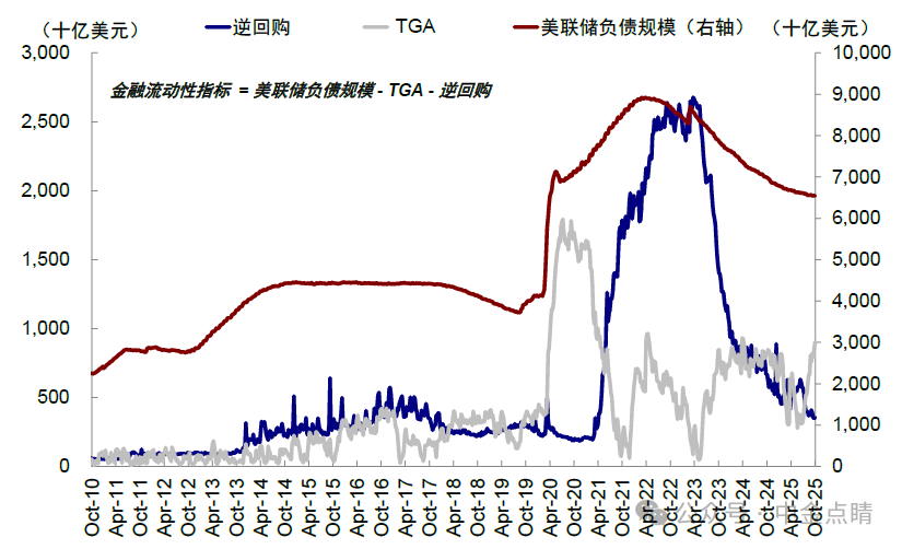 图表:以美联储负债规模-TGA-逆回购衡量,美国金融流动性有所收紧