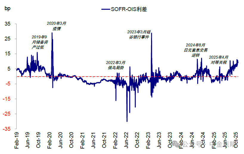 图表:近期SOFR-OIS利差明显走阔,回购市场流动性有所收紧