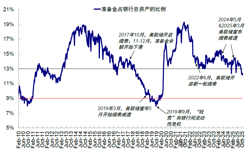图表:当前准备金占银行总资产比例为12.2%,触及过度充裕和适度充裕的临界点
