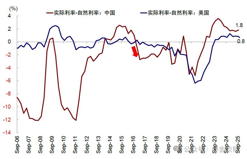 图表:当前美国实际利率和自然利率之差为0.8%,对应还有3次降息空间