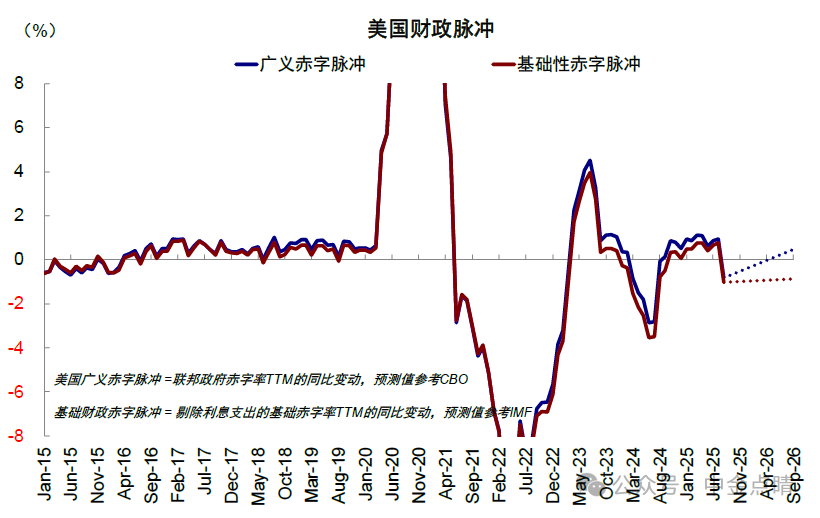 图表:2025年美国财政脉冲因高基数大幅回落,我们测算2026财年将转正至0.5%