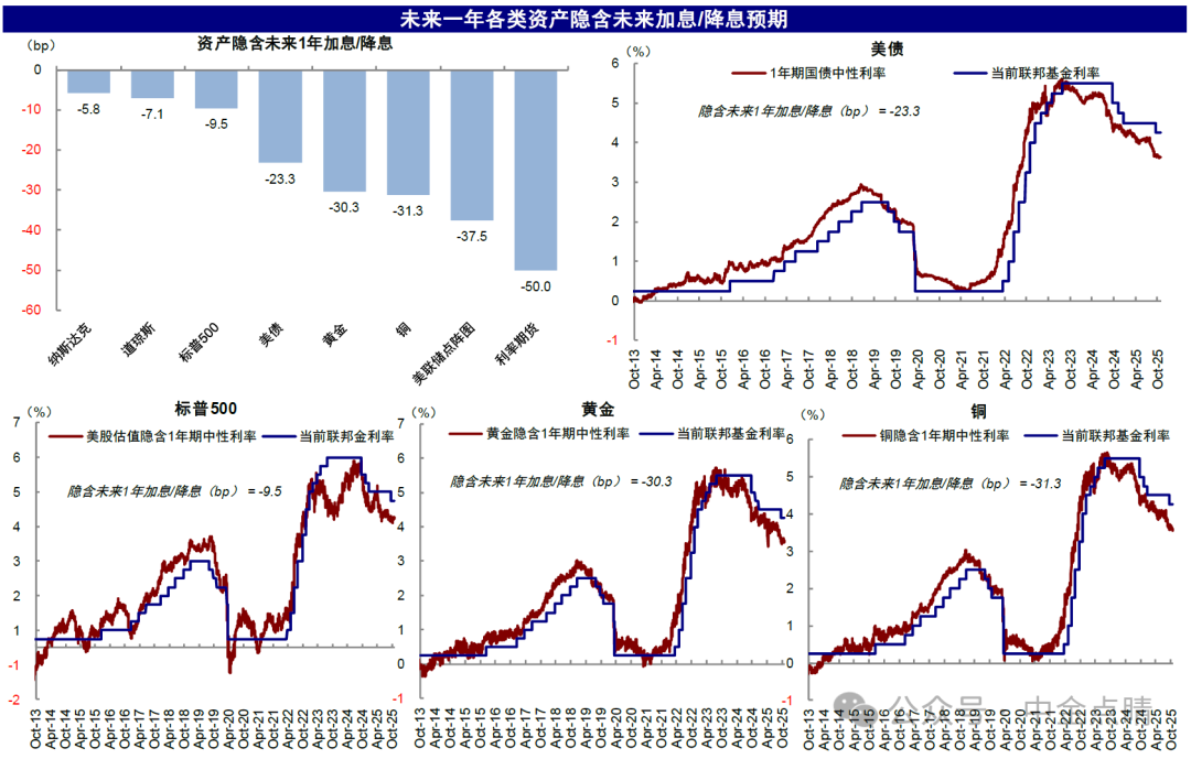 图表:当前各类资产计入的降息预期排序为:利率期货(2次)>点阵图(1.5次)>铜(1.3次)>黄金(1.2次)>美债(0.9次)>标普500(0.4次)>道琼斯(0.3次)>纳斯达克(0.2次)
