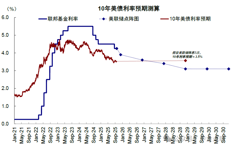 图表:基准情形下美联储仍有3次降息空间,对应长债利率中枢3.8~4%