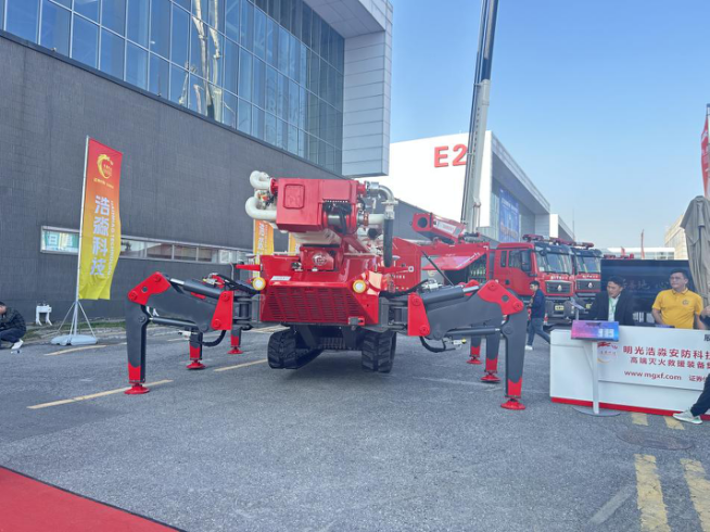 此外,在9月13日至16日举办的第二十一届中国国际消防设备技术交流展览会上,浩淼科技携多款创新产品亮相,尤其是首次亮相的国家级项目成果——六足举高灭火机器人十分吸睛,频频引得境内外观展者驻足参观与交流。