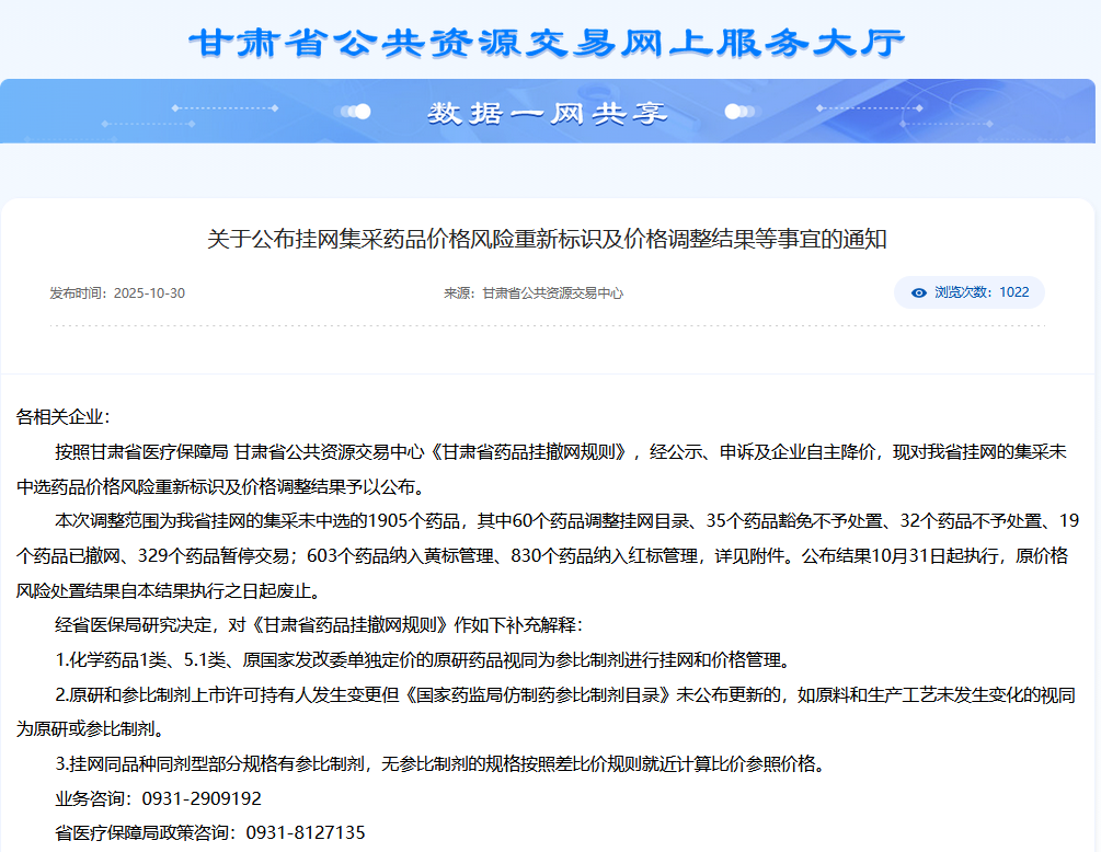 2025年10月30日,甘肃省医疗保障局与省公共资源交易中心联合发布重磅通知,1905个集采未中选药品将从明天(10月31日)起全面执行新的价格风险标识管理。