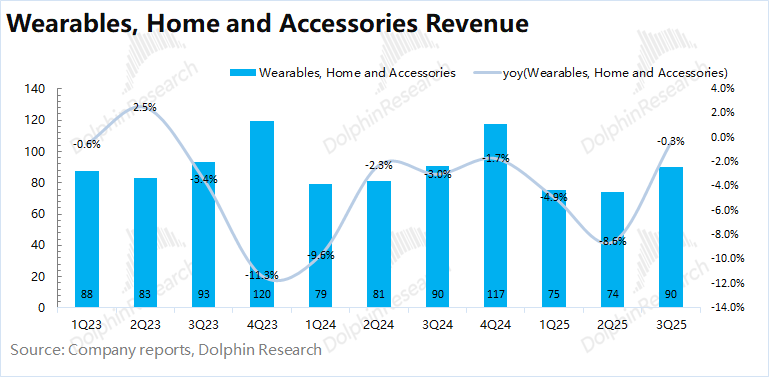 2025财年第四季度(即3Q25)可穿戴等其他硬件业务收入90亿美元,同比下滑0.3%,好于市场预期(86.4亿美元)。可穿戴及其他业务,在本季度基本止住了连续九个季度以来的下滑。
