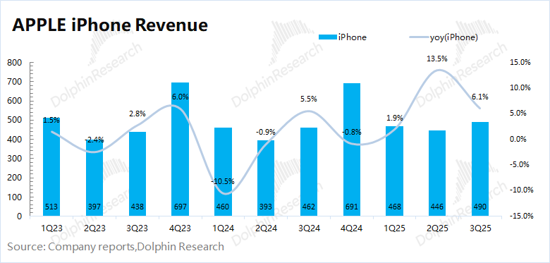 2025财年第四季度(即3Q25) iPhone 业务收入490亿美元,同比增长6.1%,略低于市场预期(493亿美元)。公司iPhone业务本季度的增长,主要得益于iPhone17系列新品以及新兴市场需求增长的带动。