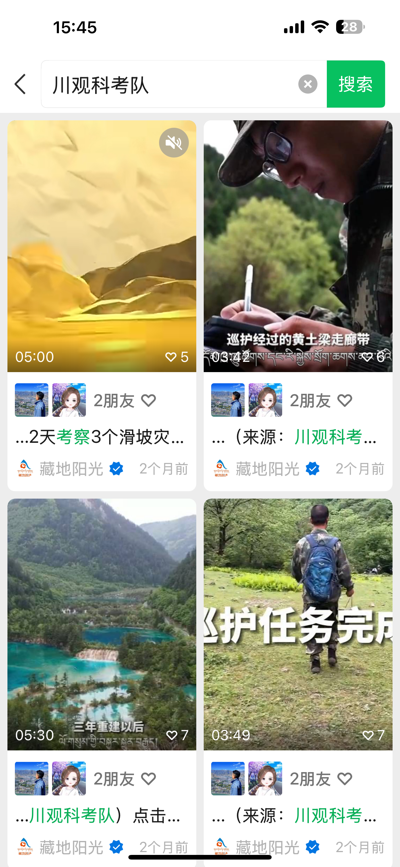 进入“藏地阳光全媒体”微信视频号,点击“搜索”,输入“川观科考队”,再点击“搜索”,选择“视频”,即可观看已发布的10期视频。