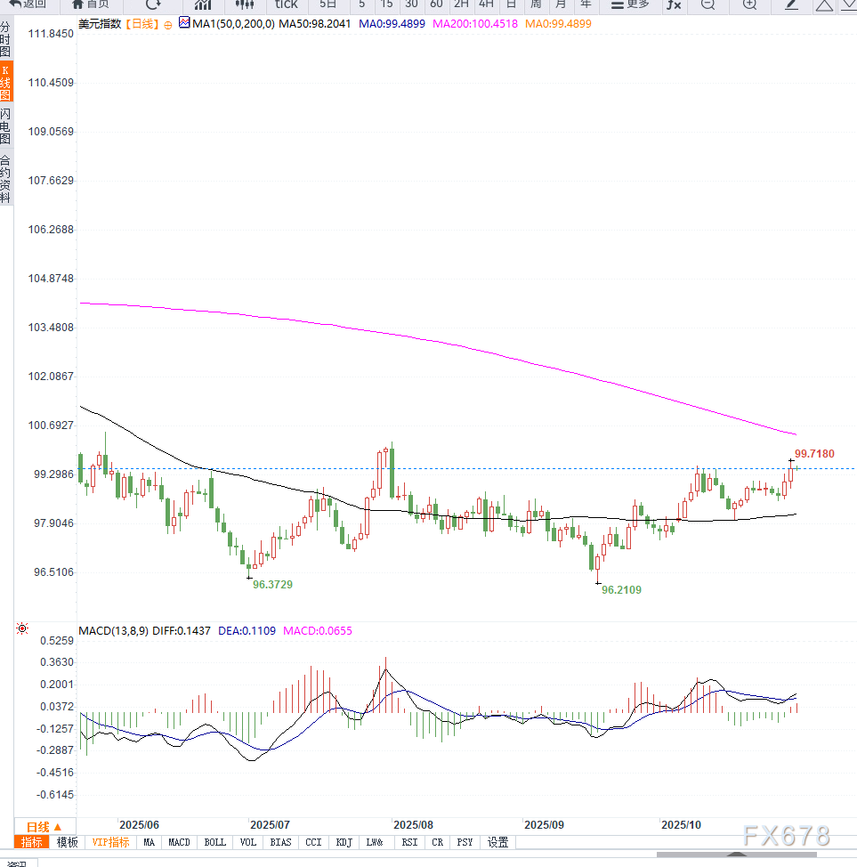 从日线图来看,美元指数自10月中旬以来维持上行通道,目前在99.50附近盘整。短期均线(MA20)支撑于98.90,长期均线(MA50)运行在98.20,表明中期趋势仍偏多。