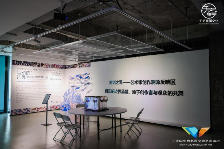 “潮汐之界”多媒体展区更进一步,将匈牙利内陆的色彩光谱溶解于南海的潮汐投影中。沙粒中浮现的电子画作、复古电视机与黎锦织物共生的装置,构建起一个关于文化记忆与再生的考古现场。