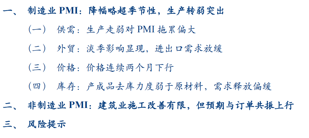 1、制造业PMI:降幅略超季节性,生产转弱突出