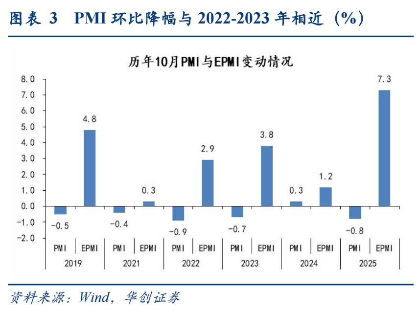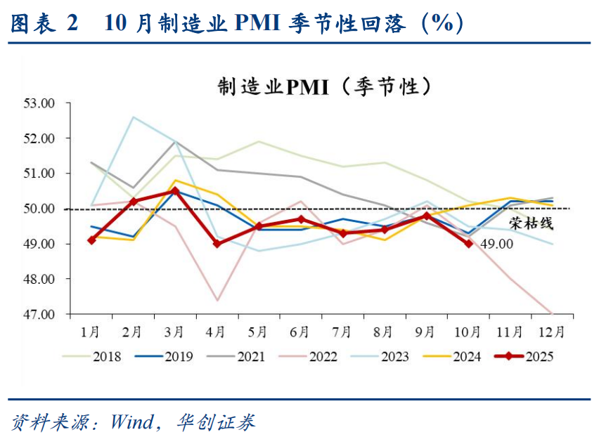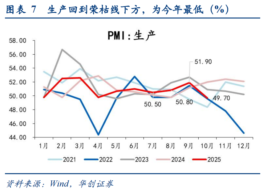 (2)生产:生产环比-2.2pct至49.7%,为年初以来最低。10月生产环比降幅超过同期,一是,假期同比多增导致生产节奏受影响,二是“反内卷”持续推进,三是出口等需求对生产的支撑作用同步下降。结合来看,10月PMI进口分项环比-1.3pct至46.8%,采购环比-2.6pct至49.0%,均有回落,显示企业生产备货的积极性也较9月下降。