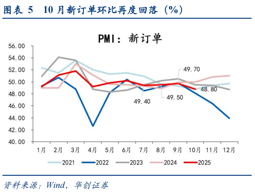 10月新订单再度下探。新订单环比-0.9pct至48.8%,为同期中性偏弱的表现(仅好于2018年、2022年),显示下游需求修复基础仍待巩固。同时,国庆假期较同期多一天,导致工作日减少,也令需求释放受到一定影响。“新订单-新出口订单”环比升至2.9pct,显示出口对新订单的拖累相对更大,而内需收缩较9月或有一定改善。