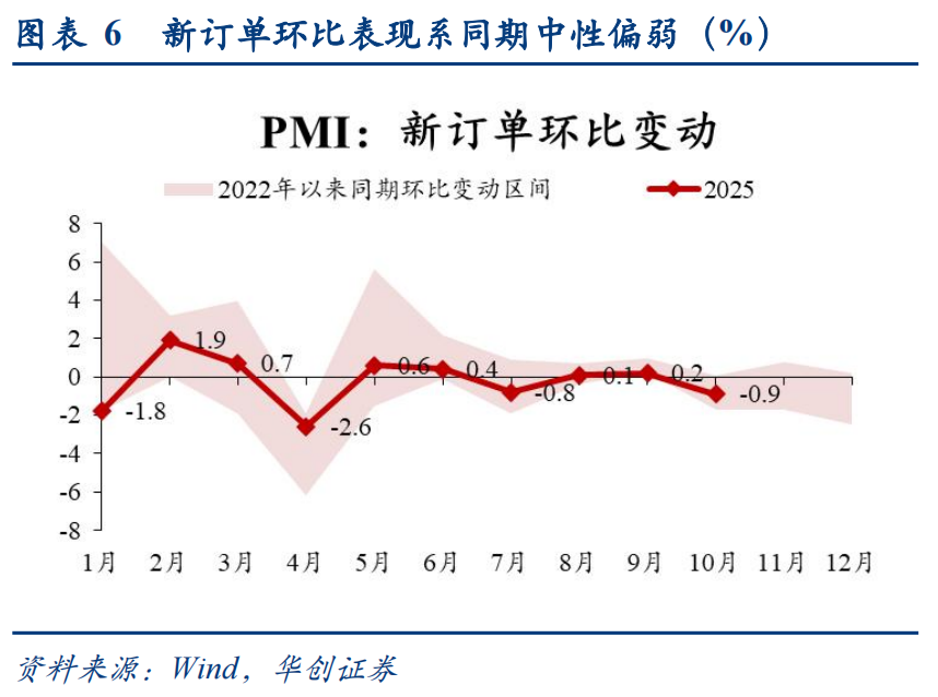 (1)新订单:10月新订单再度下探。新订单环比降幅为同期偏弱表现,下游需求修复基础仍待巩固。且假期同比多一天,工作日减少令需求释放受到影响。同时新订单与新出口订单轧差较9月略升,显示外需的拖累相对更大,而内需收缩较9月或有一定改善。