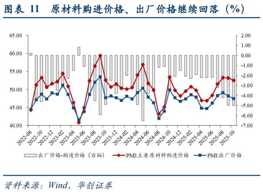 10月价格指数继续走弱,或因需求支撑不足。10月原材料购进价格、出厂价格均环比-0.7pct至52.5%、48.1%,连续两个月下滑。“反内卷”继续推进,但9-10月价格信号显示效果或有放缓,高频跟踪来看,下游需求对涨价的支撑力度不足、企业再度降价促销去库存等现象仍在,需求仍是价格修复偏弱的症结所在。