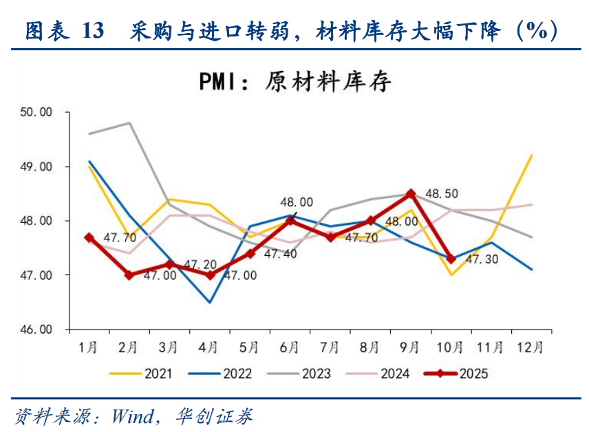 生产环比-2.2pct至49.7%,为年初以来最低。10月生产环比降幅超过同期,一是,假期同比多增导致生产节奏受影响,二是“反内卷”持续推进,三是出口等需求对生产的支撑作用同步下降。结合采购端看,10月PMI进口分项环比-1.3pct至46.8%,采购环比-2.6pct至49.0%,均有回落,显示企业生产备货的积极性也较9月下降。
