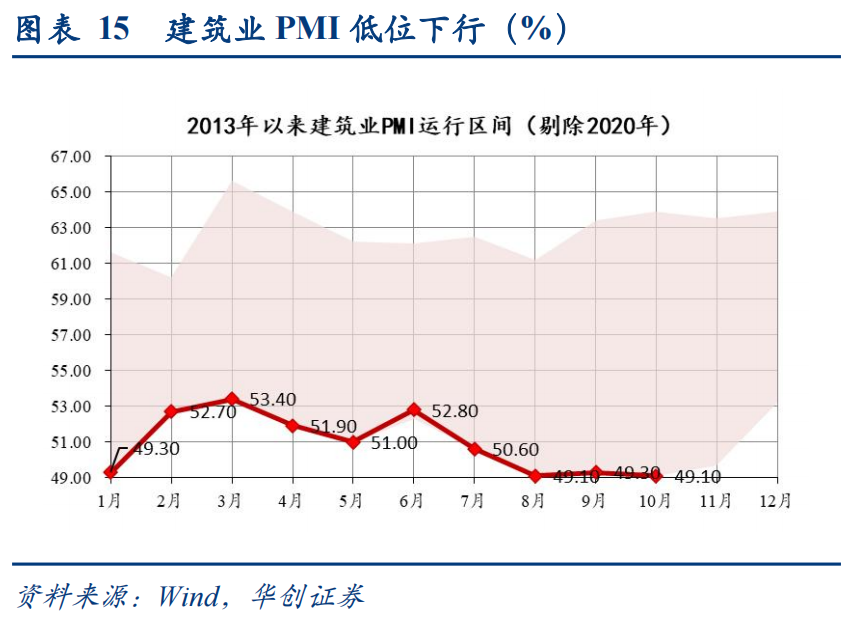 (1)建筑业:政策性金融工具影响,基建施工开始改善。建筑业PMI环比-0.2pct至49.1%。据中国物流与采购联合会披露,土木工程建筑业PMI环比升幅超5pct至55%以上。对比之下,房屋建筑业景气或在继续回落。10月基建相关建筑活动有加速启动的迹象,或主因政策性金融工具加快投放,资金到位改善对项目施工的支撑显现。