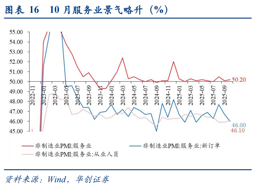 (2)服务业:服务业PMI环比+0.1pct至50.2%。国庆假期影响下,居民消费有所提振。但另一方面,服务业新订单环比降0.7pct至46%,非消费类行业需求相对收缩,或拖累了服务业PMI表现。