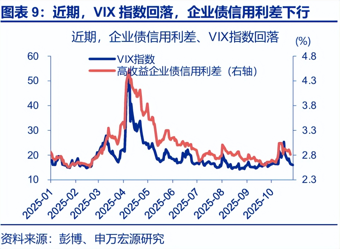 从市场表现来看,市场的担忧也并未持续。2023年,在美联储3月12日推出BTFP后,硅谷银行对标普500指数的外溢影响随即见底,但标普转涨后,银行板块尤其是区域性银行板块的相对滞涨仍延续至了4月底。背后的原因在于,第一,HTM/AFS未实现亏损虽被时间换空间,但资本与再融资弹性受限;第二,市场预期会有更严的资本/流动性要求压制银行业ROE与估值;第三,商业地产与中小企业信用周期担忧仍存,对银行业仍有压制。而本轮中,区域性银行股价已经开始回升;VIX指数的回落、企业债信用利差的下行同样也在反应市场担忧的缓和。