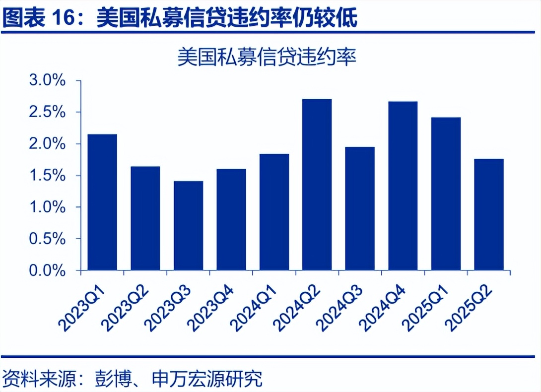 当下私募信贷硬违约率仍相对较低,且外溢的风险相对有限。一方面,私募信贷违约率长期在1–2%区间,截至2025年二季度末,私募信贷违约率约1.8%。另一方面,私募信贷为非交易私募贷款,通常持有至到期,负债端久期远长于银行短期同业负债,外溢风险更为可控。