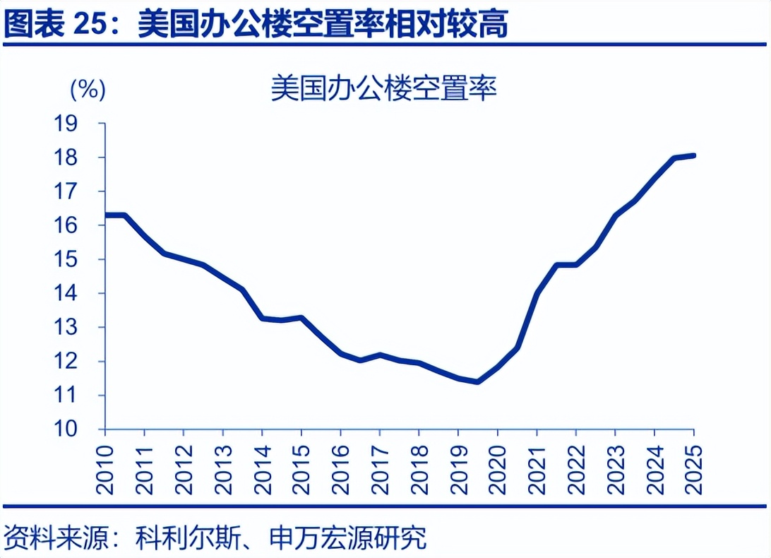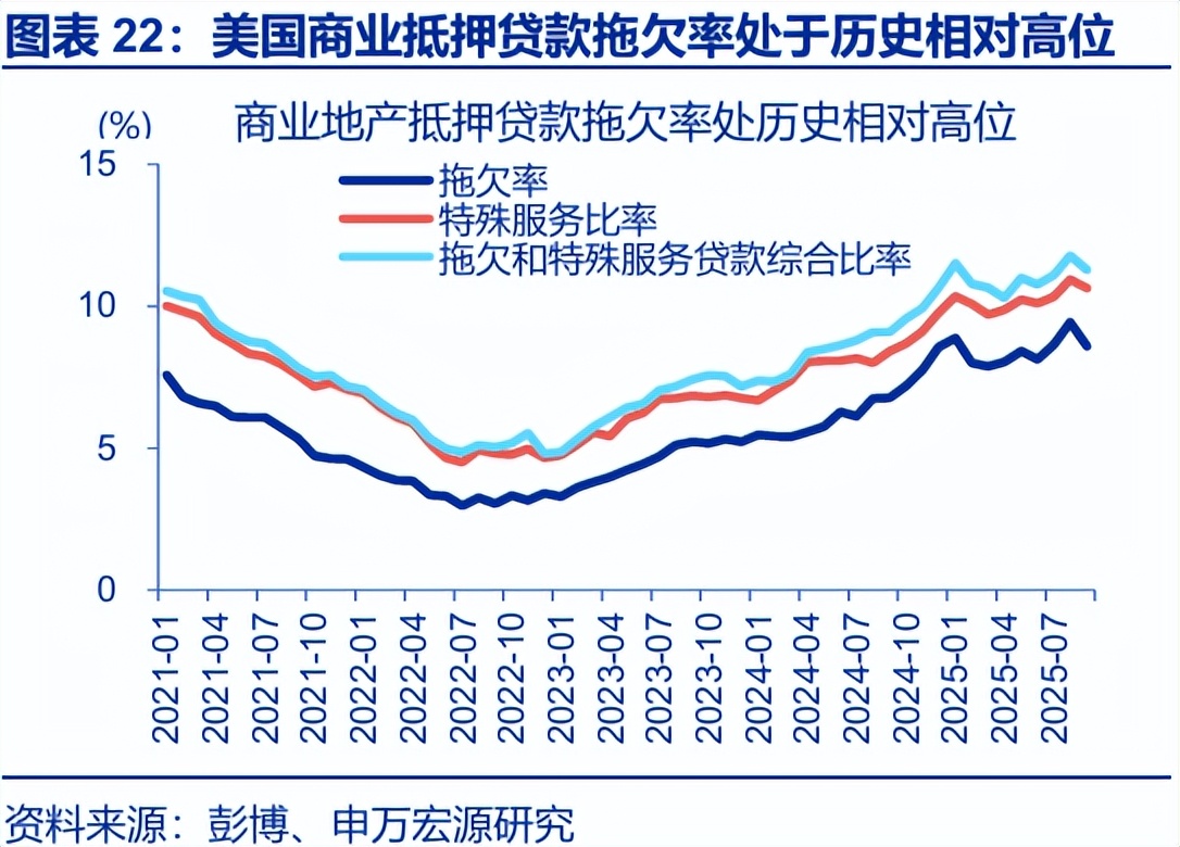 首先,商业地产和商业抵押贷款支持证券仍是值得关注的风险之一。2025年8月,商业抵押贷款支持证券CMBS的拖欠和特殊服务贷款率达到11.8%、创历史新高。办公楼物业长期空置是造成这种困境的主要原因;截至2025年年中,美国办公楼空置率高达18.4%、创历史新高。
