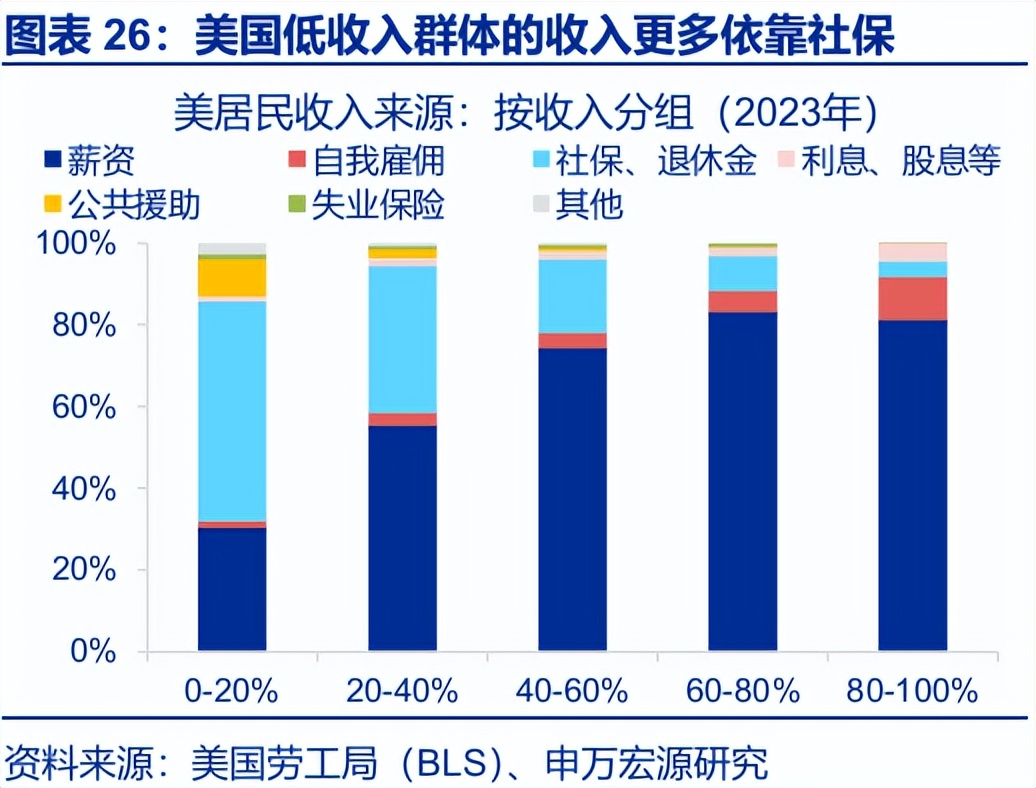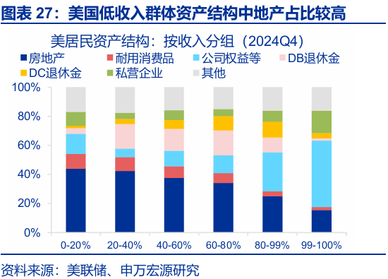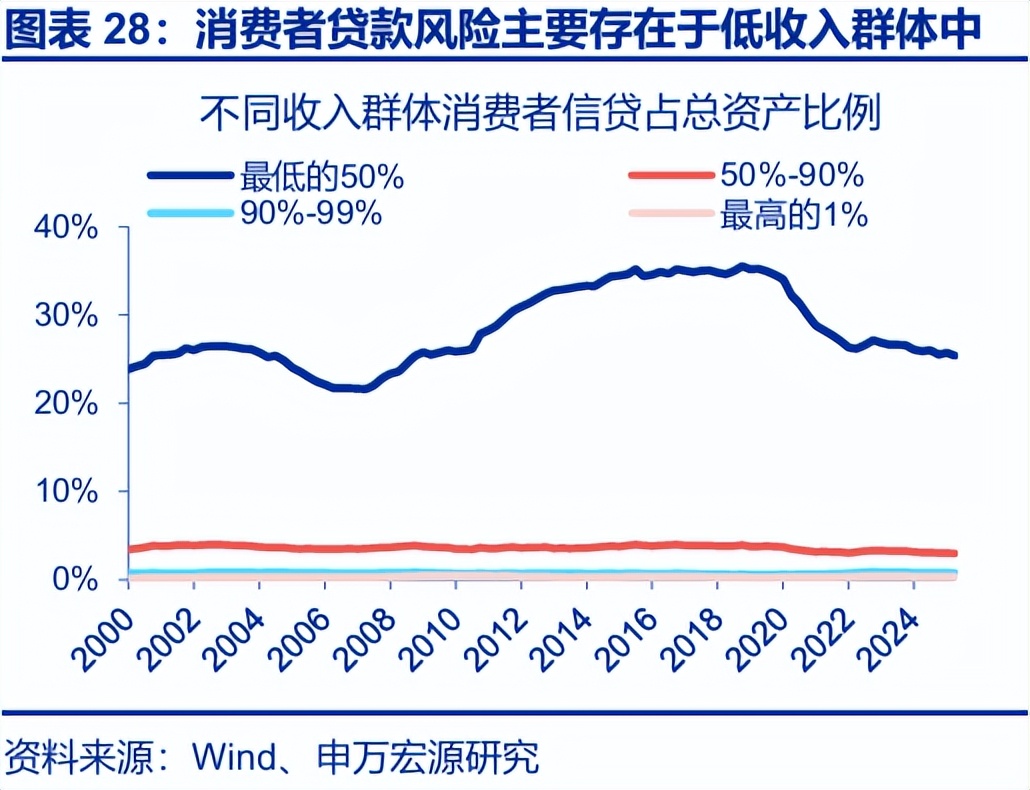 其次,美国低收入群体涉及的消费者信贷等风险,同样值得关注。从收入结构上,美国低收入群体高度依赖社保与薪资,同时其资产结构中房地产也有着较高的占比。而经济下行周期中,福利削减、劳动力市场放缓、房地产价格下滑三者往往相伴发生。这一背景下,收入端较为脆弱、资产端易受房价下行冲击的低收入群体信贷风险更易暴露。从消费者信贷占总资产比例来看,当前美国消费者贷款风险主要存在于低收入群体中。截至2025年二季度,汽车贷款、信用卡贷款的拖欠率均已攀升至历史次高位;后续这类易受低收入群体影响的消费者信贷风险,或值得持续关注。