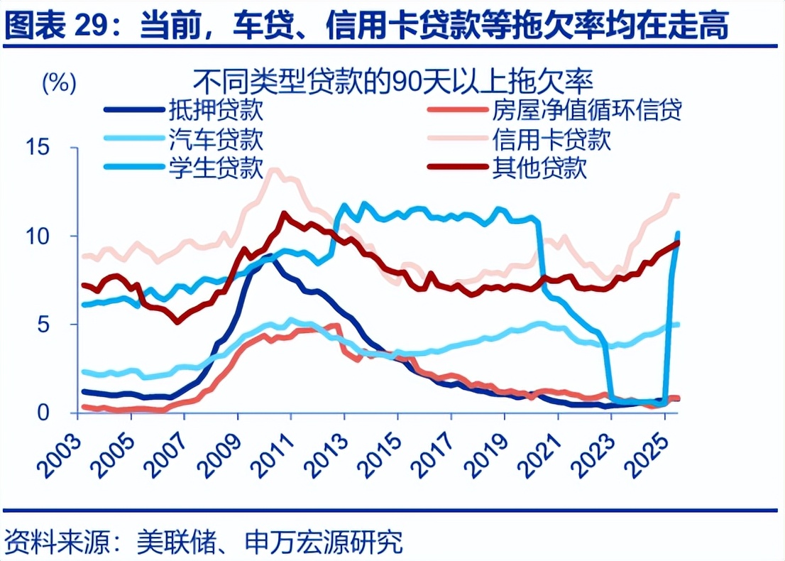 其次,美国低收入群体涉及的消费者信贷等风险,同样值得关注。经济下行周期中,福利削减、劳动力市场放缓、房地产价格下滑往往相伴发生,这一背景下,低收入群体信贷风险更易暴露。截至2025年二季度,汽车贷款、信用卡贷款的拖欠率均已攀升至历史次高位,仍有上行可能。