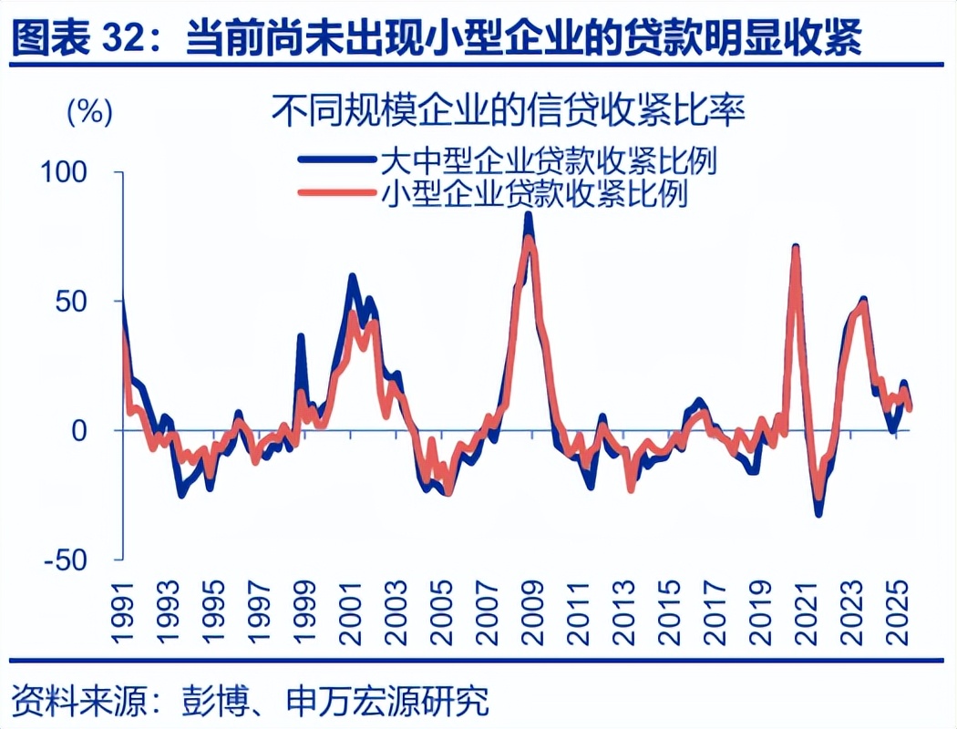 最后,过去几年屡屡引发市场担忧的高收益债风险,短期或相对可控。1)从企业债市场困境指数来看,当前投资级、高收益债的困境指数分别处于历史10.2%、11.1%的分位水平,风险相对较低。2)从滚续压力来看,未来2年内高收益率债的到期压力相对有限,且小型企业的信贷收紧比率也未现明显抬升。3)从滚续成本来看,截至10月27日,高收益债平均发行利率持续回落、已降至6.6%,仅略高于高收益债的存量债务平均利率,滚续带来的付息成本增加有限。结构上,可适当关注两点风险:第一,最低评级的发行人进入一级市场的门槛较高,或导致再融资风险高度集中;第二,一旦遭遇经济放缓或流动性收紧,市场如大幅重估信用风险,导致利差急剧扩大,或引发高收益债市场的动荡。