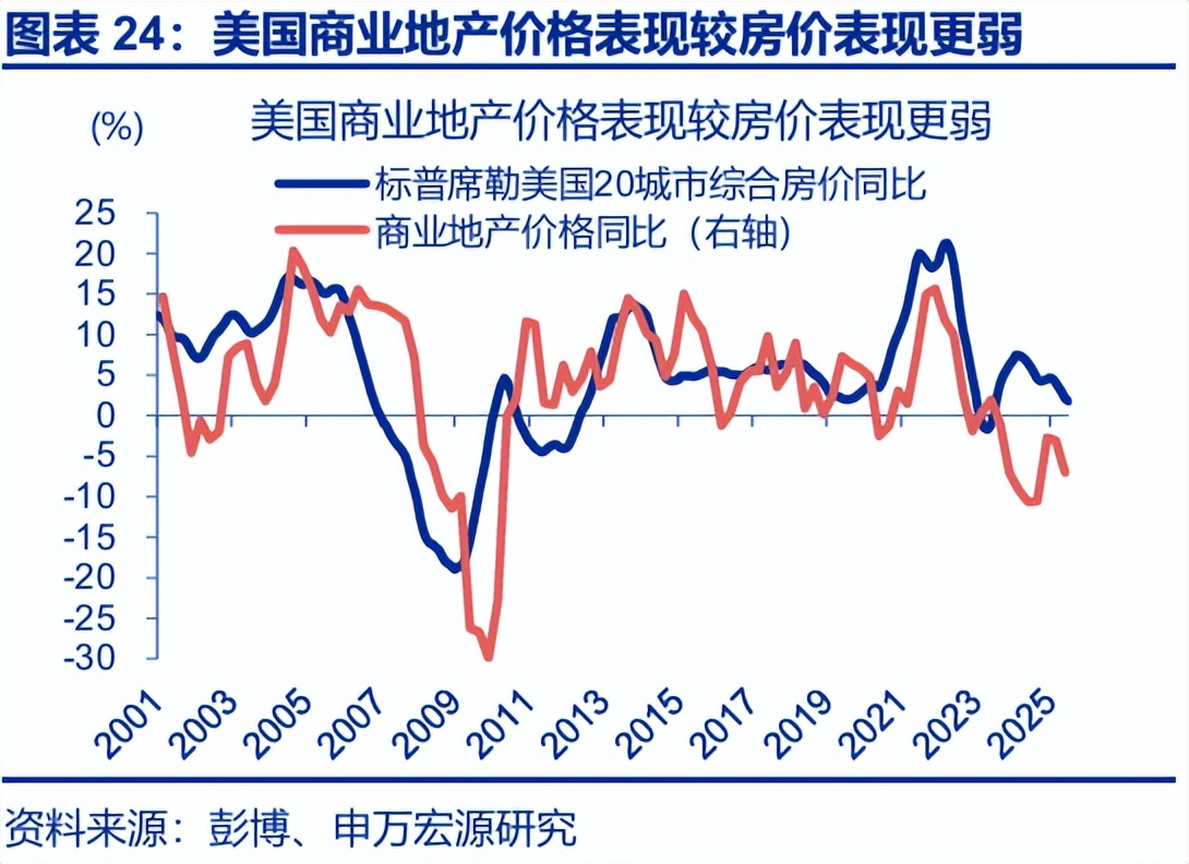 首先,商业地产和商业抵押贷款支持证券仍是值得关注的风险之一。2025年8月,商业抵押贷款支持证券CMBS的拖欠和特殊服务贷款综合比率达到11.8%、创历史新高,9月虽小幅回落、但也处于历史极高的区间。办公楼物业仍然是造成这种困境的主要原因。自2020年以来,企业现场办公需求减少、预期收入增速等持续压制商业地产的需求,而供给端的相对过剩又导致了办公楼等较高的空置率。截至2025年年中,美国办公楼空置率已高达18.4%、创历史新高。部分区域性银行CRE敞口相对较大,经济持续放缓或利率维持高位背景下,商业地产价值的进一步下行可能加剧银行资产质量恶化,甚至引发连锁反应。