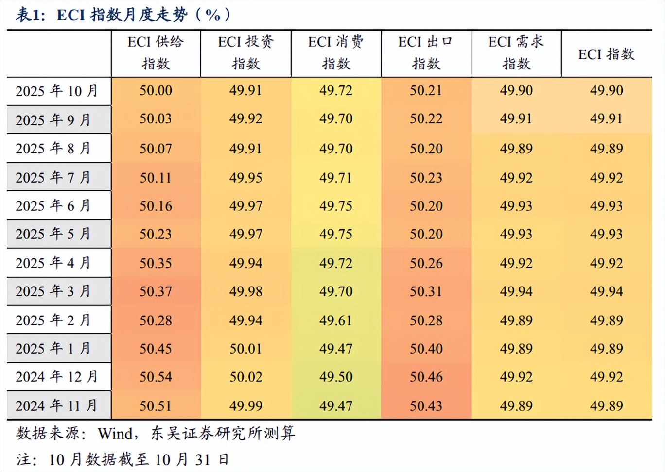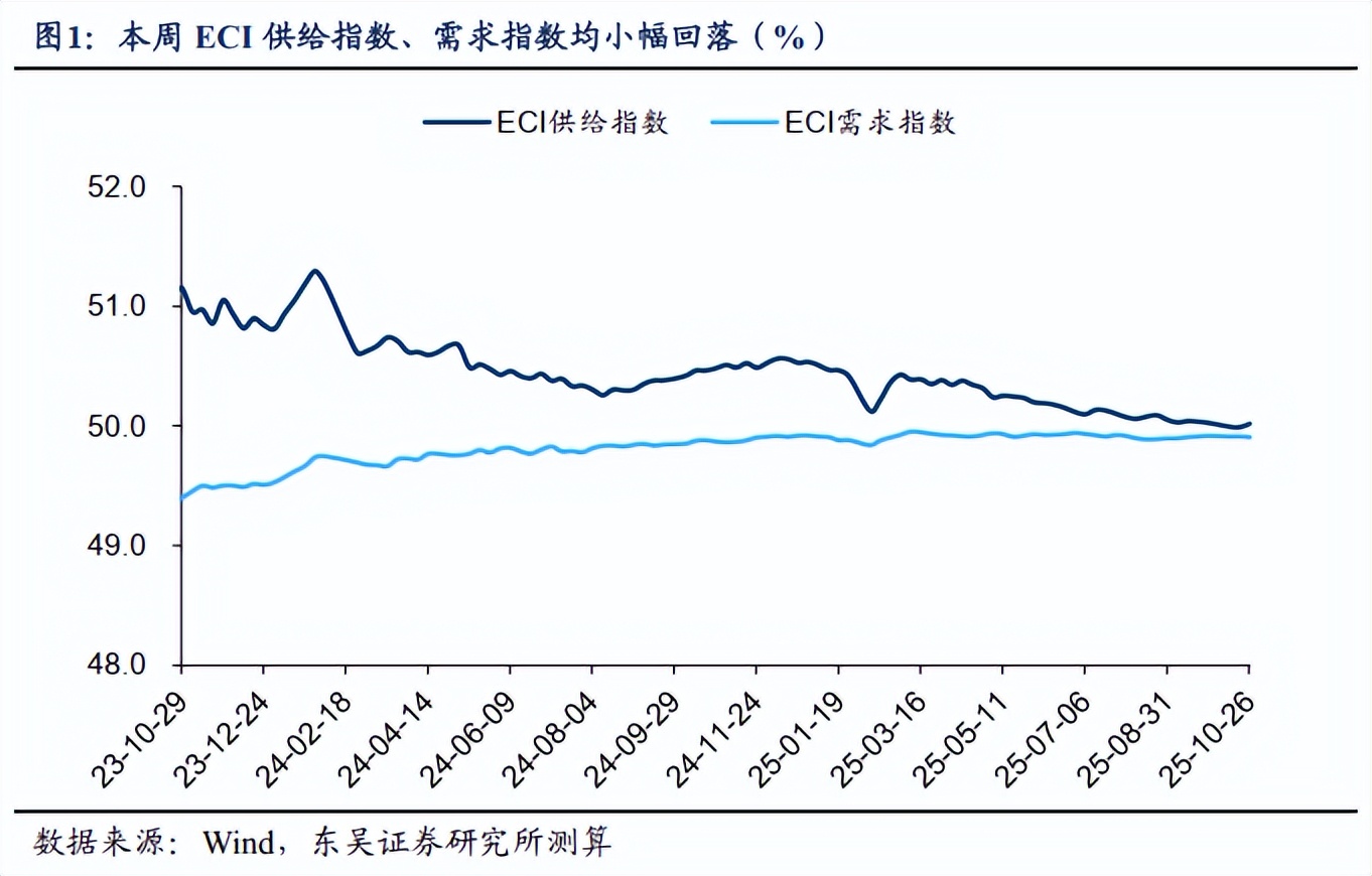 从周度数据来看,截至2025年11月2日,本周ECI供给指数为50.00%,较上周回落0.02个百分点;ECI需求指数为49.88%,较上周回落0.03个百分点。从分项来看,ECI投资指数为49.91%,较上周回升0.01个百分点;ECI消费指数为49.69%,较上周回落0.04个百分点;ECI出口指数为50.17%,较上周回落0.04个百分点。