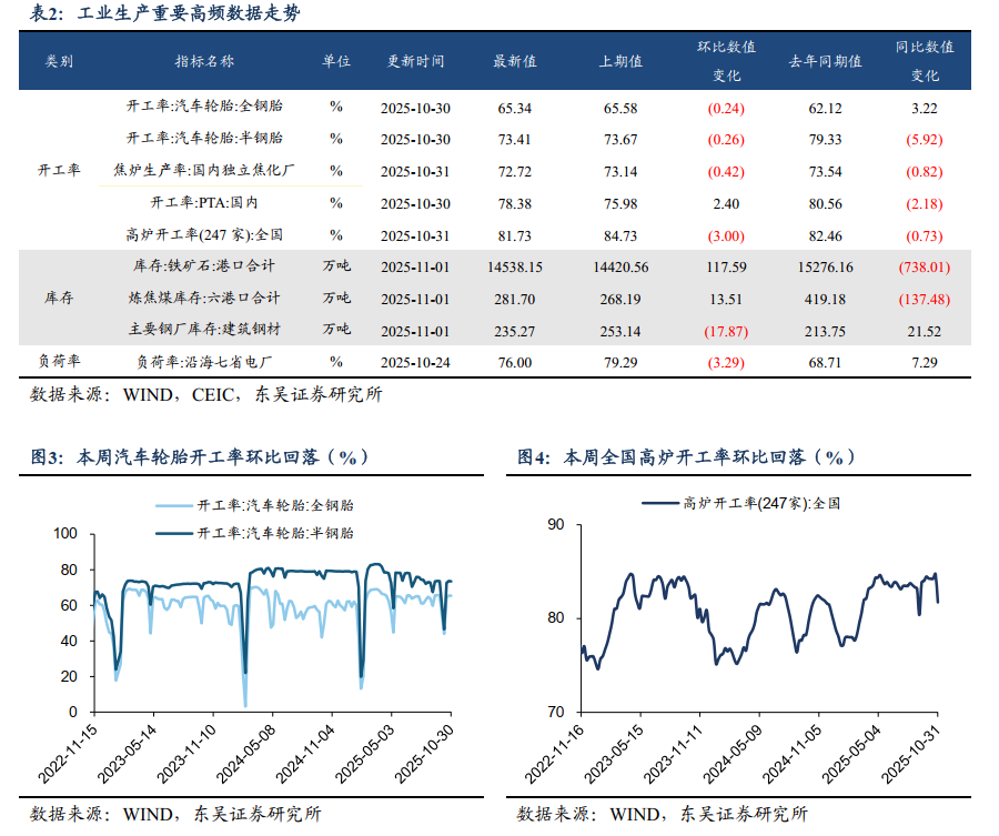 开工率方面,本周主要行业开工率环比小幅回落。其中本周汽车全/半钢胎开工率分别为65.34%和73.41%,分别环比回落0.24个百分点和0.26个百分点;本周PTA开工率录得78.38%,环比回升2.40个百分点,较去年同期回落2.18个百分点;本周钢厂高炉开工率录得81.73%,环比回落3.00个百分点,较去年同期回落0.73个百分点。