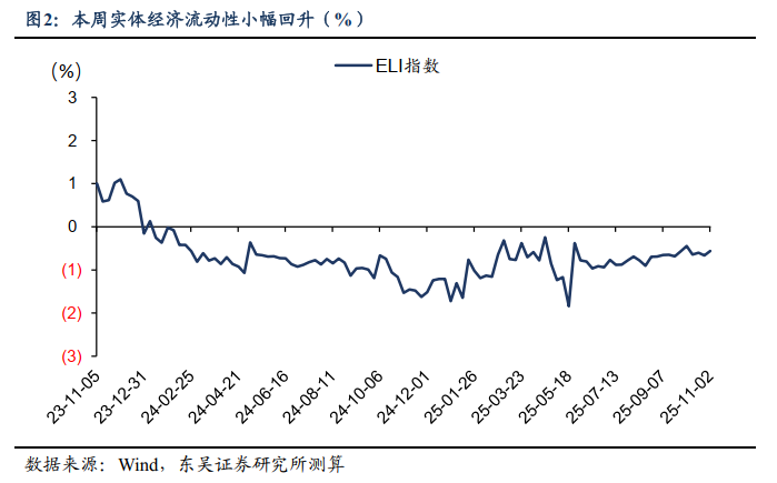 ELI指数:截至2025年11月2日,本周ELI指数为-0.56%,较上周回升0.10个百分点。如何看待“重启国债买卖”。10月27日,人民银行行长潘功胜在金融街论坛年会上表示,央行将恢复公开市场国债买卖操作。在1月10日央行公告暂停国债买卖操作后,这是首次央行明确这一货币政策工具重启,但是国债买卖的重启时机、重启方式、买入规模、操作方式等均还有待明确。根据2024年人民银行搭建起来的“逆回购调节短端流动性、MLF和买断式逆回购调节中短期流动性、降准调节长期流动性、国债买卖做有效补充”的框架,国债买卖是投放基础货币的有效补充,如果2025年11月至12月国债买卖重启,从流动性调节角度看:(1)与“稳增长”信号明确且基础货币投放成本更低的“降准”相比,国债买卖或不能替代“降准”的效果,当前实施0.5个百分点的“降准”能释放大约1万亿、操作机会成本为0.35%的基础货币,虽然2024年8月至12月国债净买入规模1万亿,从数量级上与“降准”相当,然而操作成本高于“降准”且需要兼顾对收益率曲线的影响,预计本次重启国债买卖,四季度操作规模上或较难与去年同期相当;(2)重启国债买卖是否会有效降低资金利率,当前DR001等关键期限资金利率围绕7天期逆回购利率波动,国债买卖增加银行体系超储,有利于增加跨年时点资金面的稳定性,但能否推动资金利率中枢下台阶,或仍然取决于主要政策利率是否会“降息”;(3)国债买卖或可替换MLF等中期流动性,降低银行体系负债成本,8月至10月每个月买断式逆回购和MLF合计投放6000亿元,由于中期流动性调节工具操作利率“随行就市”,以1年期AAA同业存单利率度量,1年期MLF操作利率或在1.60%-1.70%区间,国债买卖在降低基础货币投放成本的同时,也有利于纾解银行负债端成本压力,并进一步疏通偏高的同业存单利率在流动性传导中的凸点。