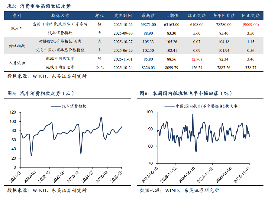 乘用车消费方面,10月26日乘用车当周日均销量录得69271辆,较去年同期回落9009辆。根据乘联会发布的最新数据,10月1-26日乘用车市场零售录得161.3万辆,同比去年同期下降7.0%,环比上月同期下降4.0%,其中新能源车市场零售录得90.1万辆,同比去年同期增长0.0%,环比上月同期下降8.0%。