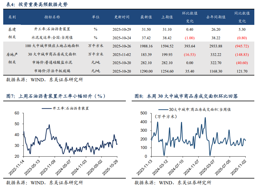 基建投资方面,2025年10月29日石油沥青装置开工率录得31.50%,环比回升0.40个百分点,较去年同期回升5.30个百分点;2025年10月24日全国水泥发运率录得37.42%,环比回落1.00个百分点,较去年同期回落0.80个百分点。