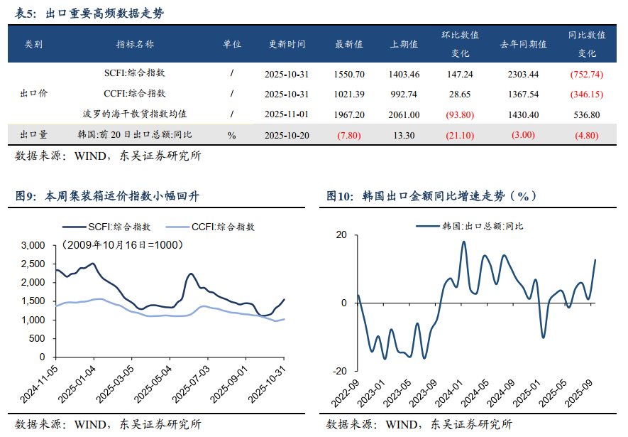 出口数量方面,韩国10月前20日出口总额同比增速录得-7.80%,较9月回落21.10个百分点,较去年回落4.80个百分点。国内方面,10月20日-10月26日监测港口累计完成货物吞吐量录得24253.8万吨,环比回落5.08%。