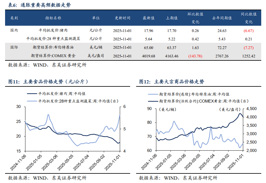 月度ECI指数:从10月整月的高频数据来看,ECI供给指数为50.00%,较9月回落0.03个百分点;ECI需求指数为49.90%,较9月回落0.01个百分点。从分项来看,ECI投资指数为49.91%,较9月回落0.01个百分点;ECI消费指数为49.72%,较9月回升0.02个百分点;ECI出口指数为50.21%,较9月回落0.01个百分点。从ECI指数来看,10月份供需两端在基数走高的背景下均出现了边际放缓,四季度经济在较高基数下可能面临一定下行压力,虽然全年达成5%的经济增长目标难度较小,但为避免经济增长下行斜率加快,四季度增量政策出台仍有必要性。供给端方面,10月份主要行业开工率较9月份环比变化不大,但同比增速均有不同程度放缓,截至10月31日PTA开工率和高炉开工率分别较去年同期回落2.18个百分点和0.73个百分点。地产方面,10月份30大中城市地产成交面积录得734.88万平方米,环比9月变化不大,符合季节性趋势,但在高基数下同比增速再度转负,由9月份的6.7%回落至-27.3%,读数压力开始凸显。出口方面,10月份监测港口货物吞吐量同比仍录得正增长,指向出口的较强韧性,而往后看:一方面,美方将取消10%的芬太尼关税,年内新增关税税率降至20%的低点;另一方面,北美节日消费需求升温,带动海运价格延续回暖。四季度出口仍将对经济增长形成较强支撑。