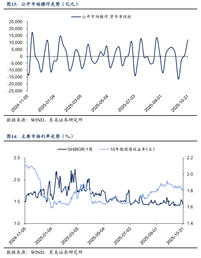如何看待“重启国债买卖”。10月27日,人民银行行长潘功胜在金融街论坛年会上表示,央行将恢复公开市场国债买卖操作。在1月10日央行公告暂停国债买卖操作后,这是首次央行明确这一货币政策工具重启,但是国债买卖的重启时机、重启方式、买入规模、操作方式等均还有待明确。根据2024年人民银行搭建起来的“逆回购调节短端流动性、MLF和买断式逆回购调节中短期流动性、降准调节长期流动性、国债买卖做有效补充”的框架,国债买卖是投放基础货币的有效补充,如果2025年11月至12月国债买卖重启,从流动性调节角度看:(1)与“稳增长”信号明确且基础货币投放成本更低的“降准”相比,国债买卖或不能替代“降准”的效果,当前实施0.5个百分点的“降准”能释放大约1万亿、操作机会成本为0.35%的基础货币,虽然2024年8月至12月国债净买入规模1万亿,从数量级上与“降准”相当,然而操作成本高于“降准”且需要兼顾对收益率曲线的影响,预计本次重启国债买卖,四季度操作规模上或较难与去年同期相当;(2)重启国债买卖是否会有效降低资金利率,当前DR001等关键期限资金利率围绕7天期逆回购利率波动,国债买卖增加银行体系超储,有利于增加跨年时点资金面的稳定性,但能否推动资金利率中枢下台阶,或仍然取决于主要政策利率是否会“降息”;(3)国债买卖或可替换MLF等中期流动性,降低银行体系负债成本,8月至10月每个月买断式逆回购和MLF合计投放6000亿元,由于中期流动性调节工具操作利率“随行就市”,以1年期AAA同业存单利率度量,1年期MLF操作利率或在1.60%-1.70%区间,国债买卖在降低基础货币投放成本的同时,也有利于纾解银行负债端成本压力,并进一步疏通偏高的同业存单利率在流动性传导中的凸点。
