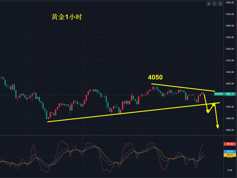 目前,金价反复以4000美元为中轴来回洗盘,上周五冲高4036美元后又回到3960美元,收敛三角形震荡突破后选择方向,只要4050-60美元没有破位调整就没有结束,只有再跌一波才能让短期追多者冷静,那个时候往往是出手的好机会。