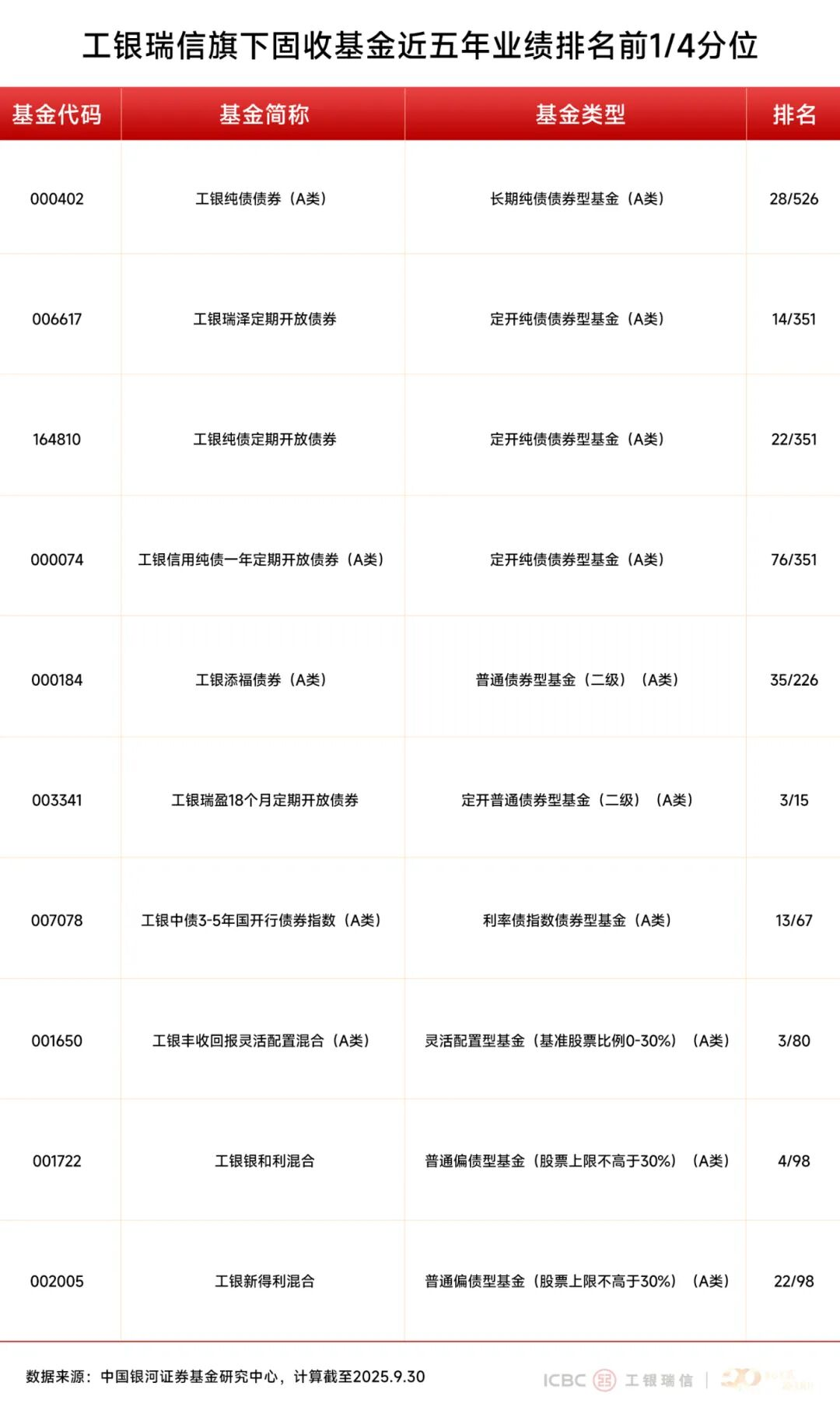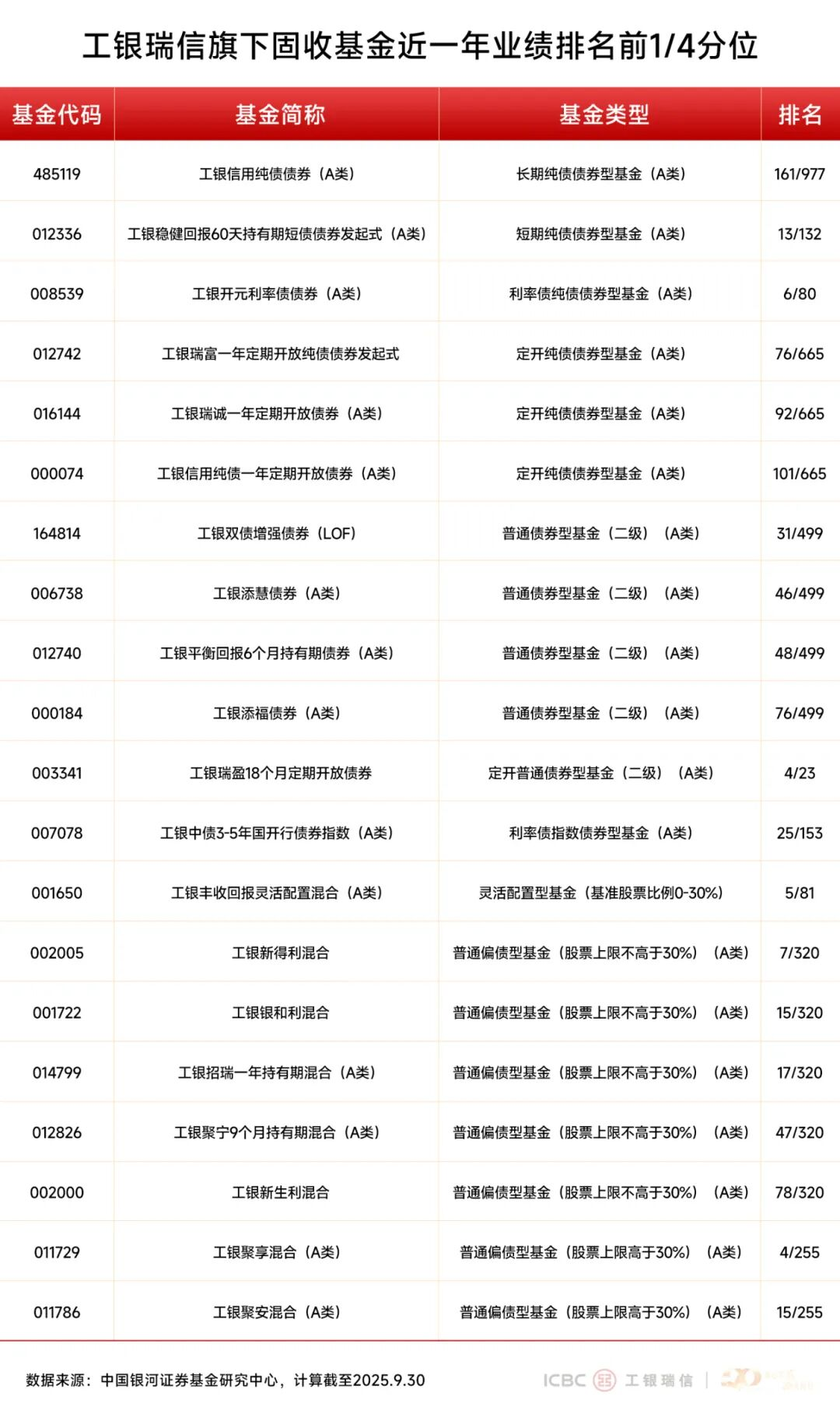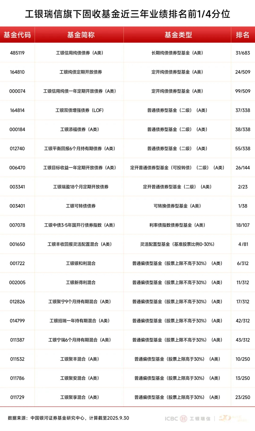 据银河证券数据显示,截至2025年9月30日20只基金在近一年收益排名中位居同类前1/4,其中包括6只纯债基金,另外工银可转债债券在近3年38只同类产品中位列第1。