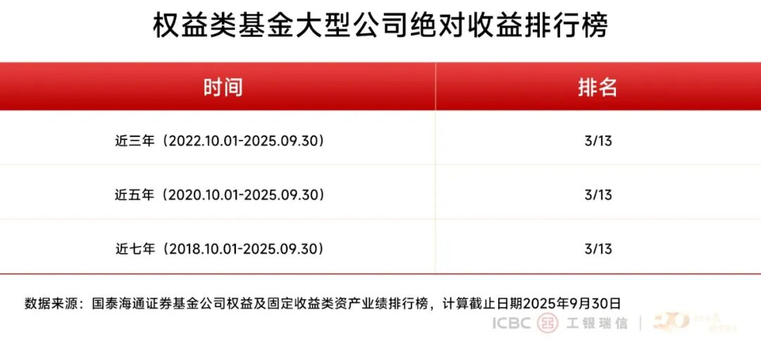 面对市场持续波动,工银瑞信主动权益团队坚持长期投资理念,通过系统化的投资流程和纪律严明的投资框架,力争实现跨越周期的稳健回报。据国泰海通证券发布的基金公司权益类资产业绩排行榜单数据,截至2025年9月30日,工银瑞信基金在13家权益类大型公司中近7年、近5年、近3年的绝对收益排名均为第3(3/13),近7年、近5年、近3年权益类基金大型公司超额收益排名分别为第2(2/13)、第3(3/13)和第2(2/13),均彰显了穿越牛熊的投资实力。