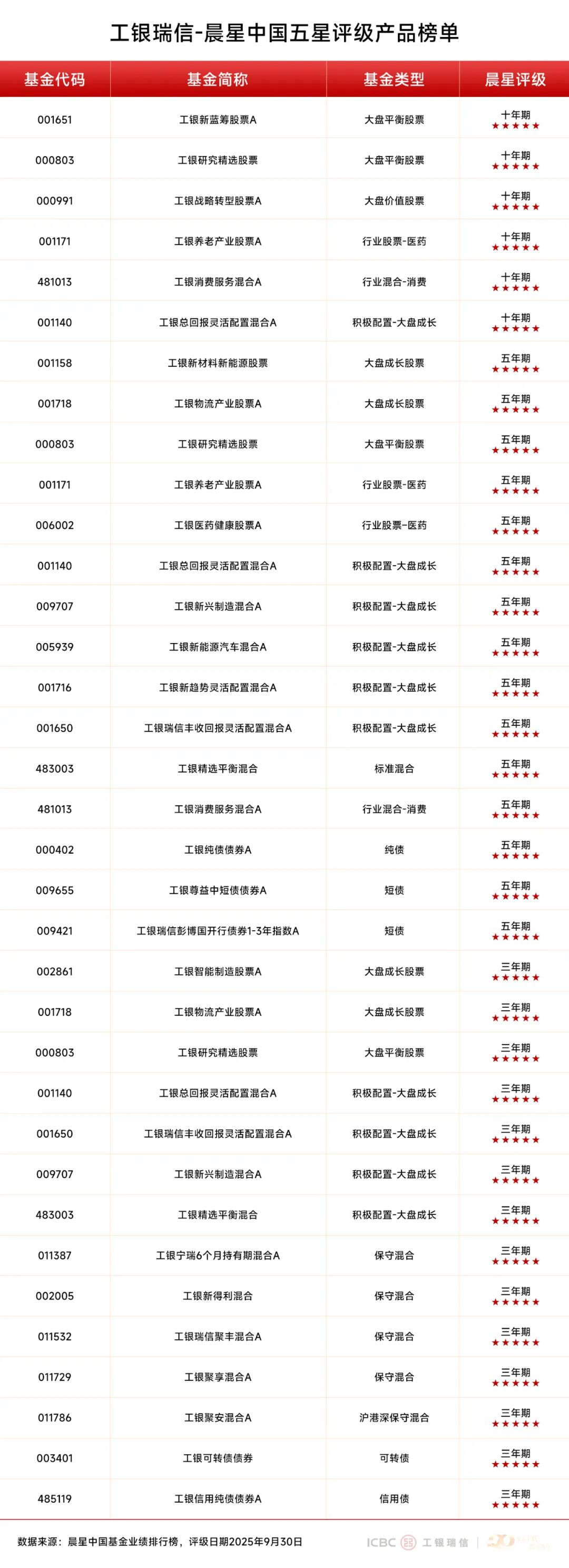 Morningstar晨星中国最新出炉的业绩榜单显示,截至2025年9月30日,6只基金获得晨星十年期五星评级、15只基金获得晨星五年期五星评级、14只基金获得晨星三年期五星评级,工银瑞信凭借其稳健的表现和卓越的投资能力,不断获得权威机构的认可,为投资者的多元化布局提供了有力支持。