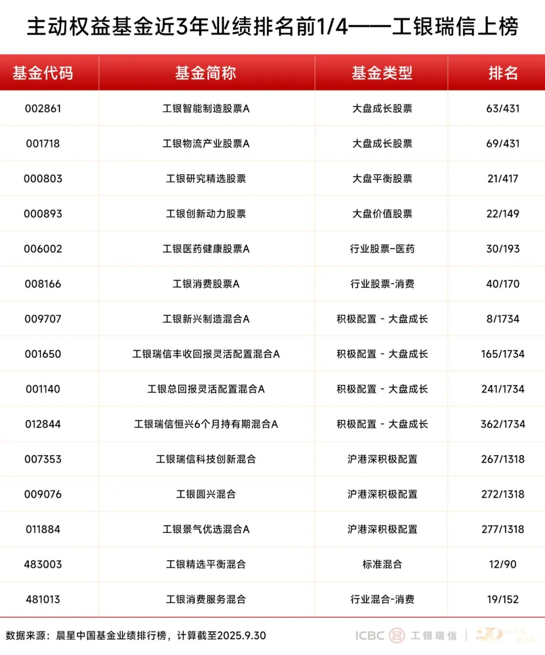 3、权益类大型超额收益排名、权益类基金超额收益排名来源于国泰海通证券,数据截至2025年9月30日。工银瑞信权益类基金大型公司超额收益七年(2018. 10.01-2025.9.30)行业2/13,近五年(2020.10.01-2025.09.30)行业3/13,近三年(2022.10.01-2025.09.30)行业2/13;工银瑞信权益类基金大型公司绝对收益近七年(2018. 10.01-2025.9.30)行业3/13,近五年(2020.10.01-2025.9.30)行业3/13,近三年(2022.10.01-2025.09.30)行业3/13。