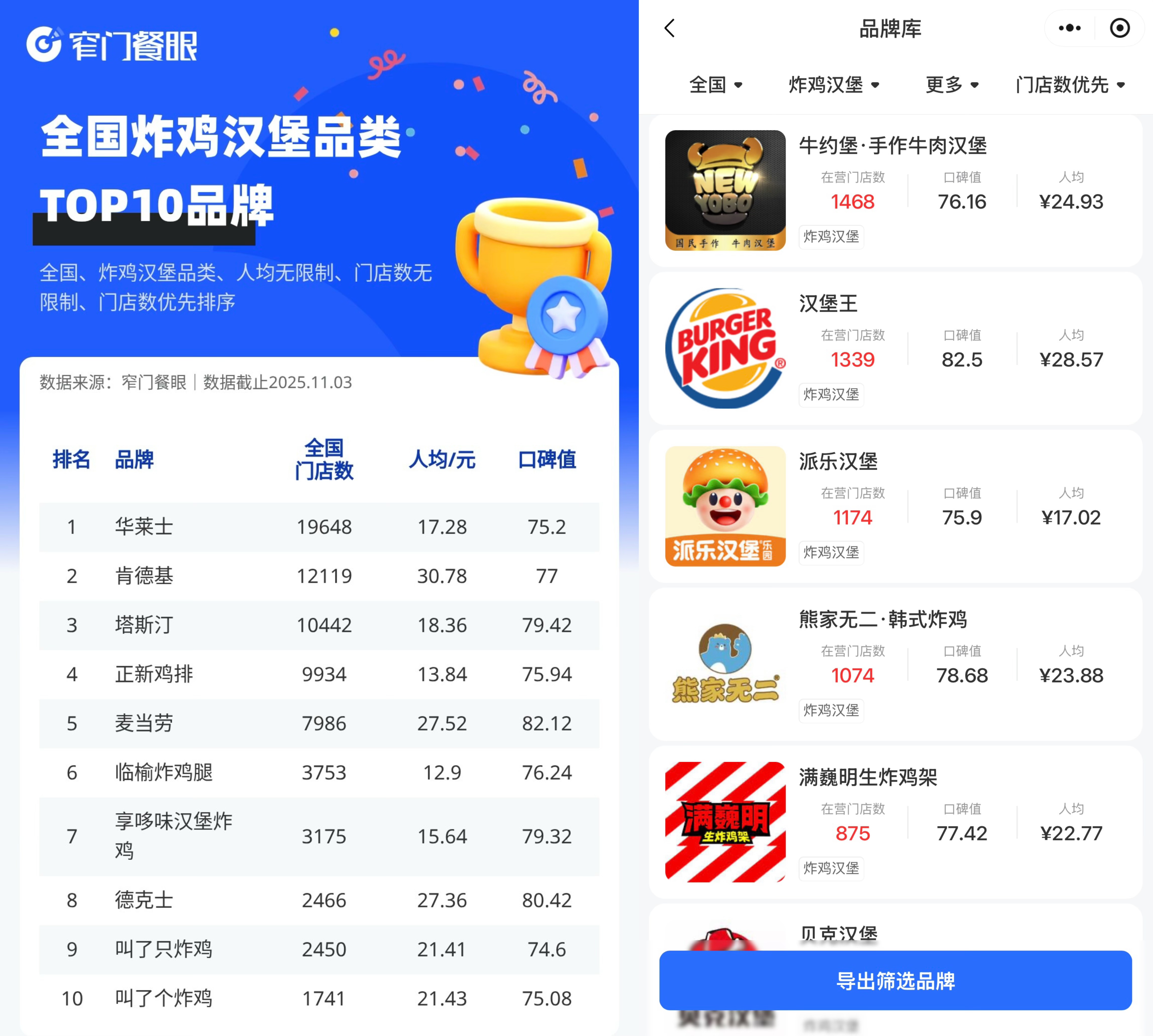 截然不同的是,同品类的不少品牌都在加速扩张。窄门餐眼数据显示,截至今年11月3日,在炸鸡汉堡品牌里,门店数排名前10位的分别是:华莱士、肯德基、塔斯汀、正新鸡排、麦当劳、临榆炸鸡腿、享哆味汉堡炸鸡、德克士、叫了只炸鸡、叫了个炸鸡。