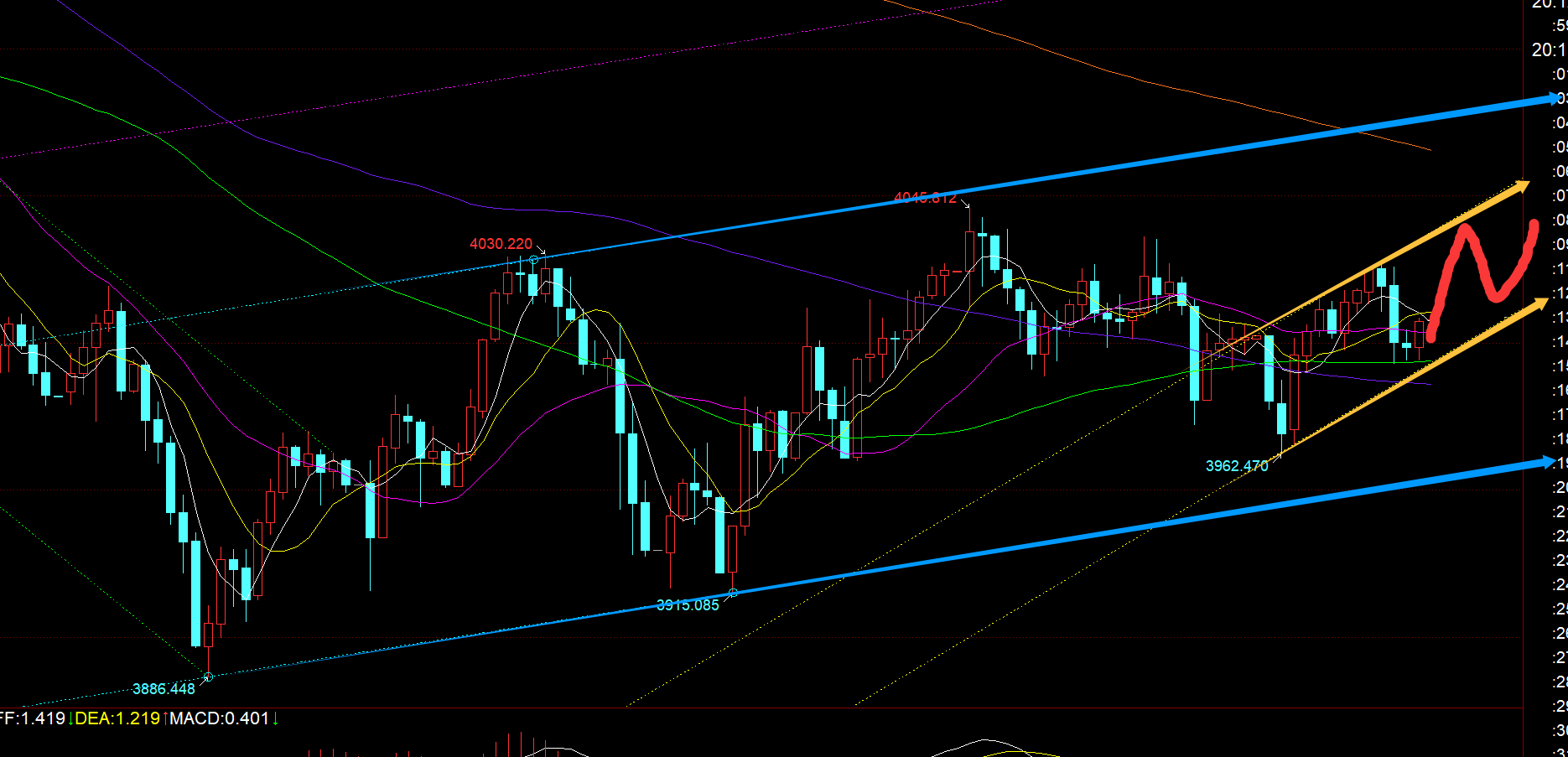 第一,黄金方面:日线级别当前是符合周视频指出的震荡,围绕5日和10日之间争夺整理,早间刺破5日是一个假动作;所以,最终要看收盘的有效性,10日阻力下移4036-38, 5日支撑3983;
