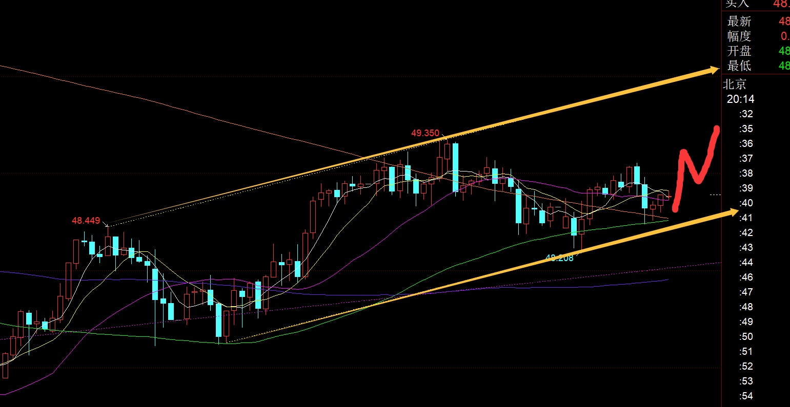 第二,白银方面:对于白银,日线级别是中轨压制49.45, 5日和10日共振支撑于48.2,所以也是震荡争夺中; 从上图看,也有一个黄色上行通道,下轨支撑今晚留意48.5-48.6上,小时线中轨也有所突破,和黄金走法雷同,倾向于稳住中轨震荡上行反弹,然后再冲高回落,慢慢磨上行通道内;